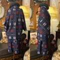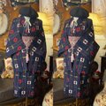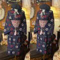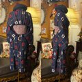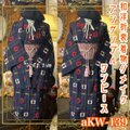 深い藍色の地に、赤と白の絣、そしてグリーンの矢羽根模様が整然と並ぶ、アンサンブル・リメイクです。