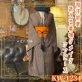 【単衣着物リメイク ワンピース|洗える化繊素材&帯サッシュベルト付き レトロ 古着 ハンドメイド シャープ・幾何学ストライプ・モダン KW-1234 】