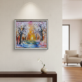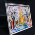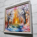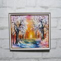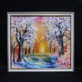 「冬の夕陽」は、静けさの中に温もりを感じる、特別な油絵作品です。サイズは縦242mm×横272mmで、冬の森に差し込む力強い夕陽の光が見事に描かれています。この作品は、雪をまとった木々と、色とりどりの夕陽のグラデーションを通じて、心に残る優しいひとときを提供します。