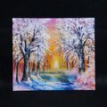本作品の特筆すべきポイントは、黄、オレンジ、レッドバイオレットの美しい夕陽の色合いです。この色彩が凍てつく景色に温もりを吹き込み、観る者に希望の静けさを伝えています。また、青と白のコントラストが効いた雪の道は、冷たい空気感を感じさせ、まるでその場にいるかのような臨場感を与えてくれます。