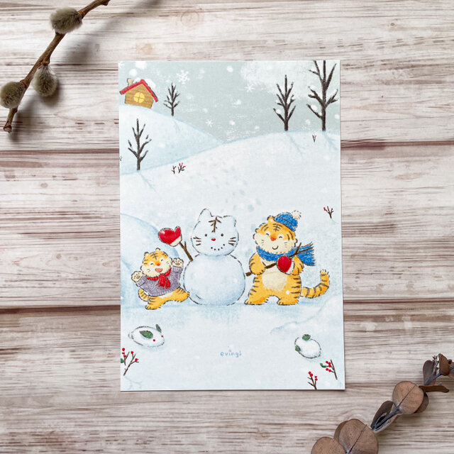 はがき ポストカード イラスト 1月 January 虎 トラ 雪 Winter 冬 雪だるま snow