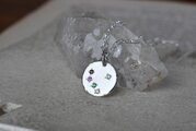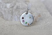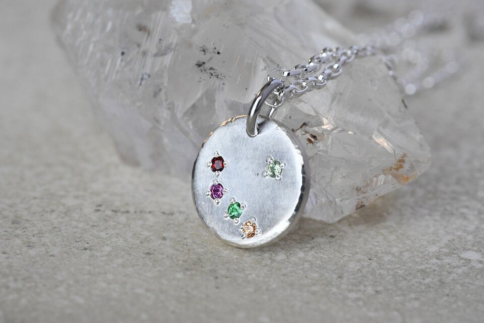 丸いシルバーのペンダントトップに5色のガーネットを留めて制作を行いました。通常ガーネットと言えば深い赤色を思い浮かべると思いますが実に多様な色がある魅力的な石でもあります。