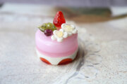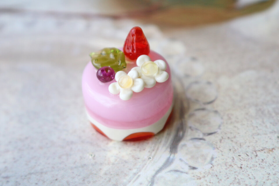 バーナーワークの技法で制作した、とっても小さなガラスの苺ケーキです。