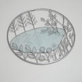 今回は 湖畔の樹々が映る水鏡を表現してみたくて、湖を型取った石膏型に樹の枝の形を写し取ったラインを丁寧に彫り込んで、ガラスを入れて焼成して 大きな板状の湖のパーツを作り、レリーフ面を裏側に、ガラスが溶けて水面のようになっている面を表側に設置しているので、透き通った水に銀色の樹々が映り込んでいるように見えます。