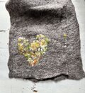 本体はメリノ羊毛を広げ、お湯と洗剤をかけてビニール手袋をつけて手で擦りフェルト化し、本体の生地を制作しています。