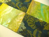 ■帯を繋いでリメイクいたしました。青っぽい部分はおよそ100年前の帯地を使用しています。玉虫色の帯地と交互につないでモダンな雰囲気に仕上げました。1と2枚目の画像はイメージ画像になり実物と若干柄の位置が違います。3枚目以降の画像を参考にしてください。