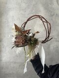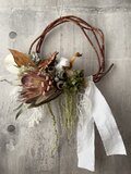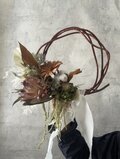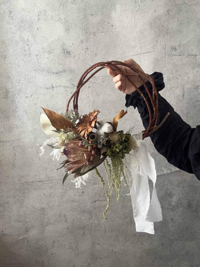 サイズ約35×30㎝長くお楽しみ頂ける色保ちの良いドライフラワーや、プリザーブドフラワーを使用しています。プロテアやグレビレアの葉を使用し、角度を付けて楽しめる形に仕上げました。ブラウンにグリーンを合わせて遠目に見た時にメリハリが出るようバランスを考えました。時間経過によりいずれはゆっくりと退色していきますが、光や日差しが当たらない涼しい屋内の場所ですと、いい状態を保ちやすいです。お花が過ごしやすい場所に飾ってあげるのもいいのですが、お客様が1番飾りたい場所で飾っていただくのもいいかもしれません。