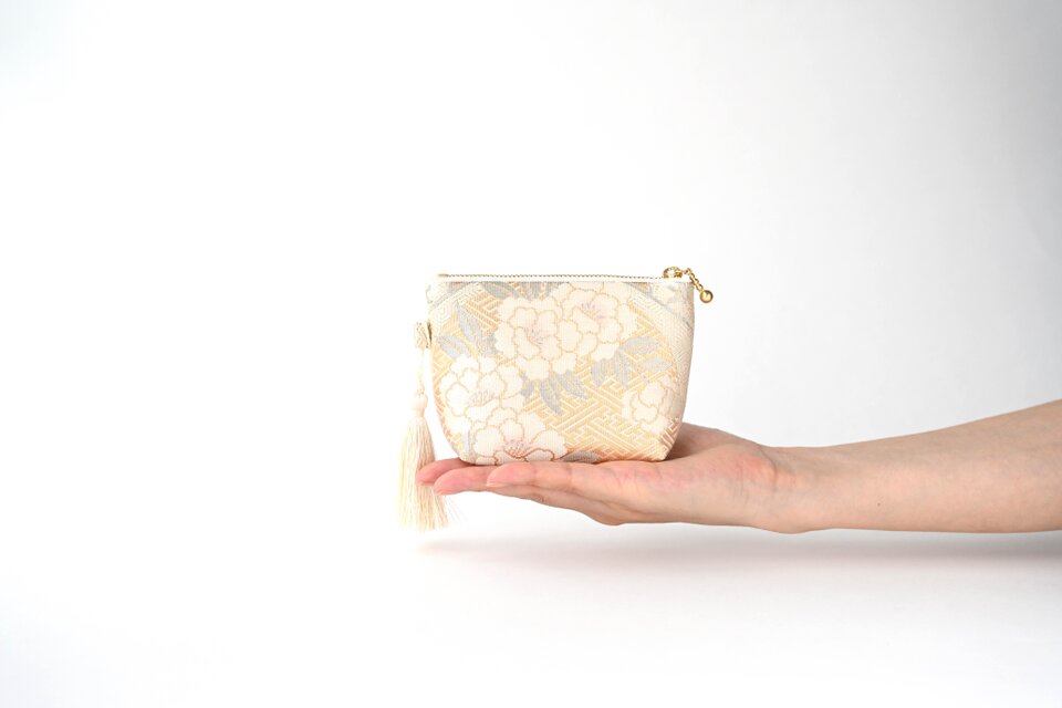 落ち着いたベージュに上品なシルバーが重なる、花丸模様のシルク帯を使って製作したミニポーチです。