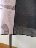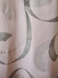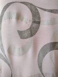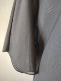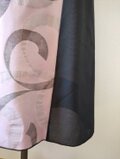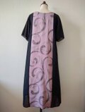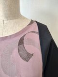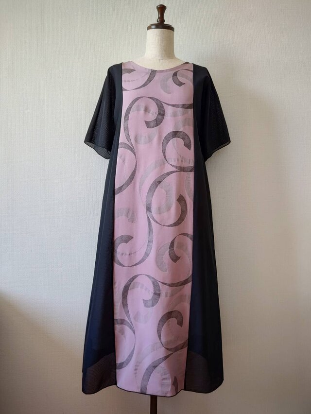撫子色の幾何学模様と黒の紗の着物を使った品のある透け感のあるワンピースとなります。着物としては、どちらも夏物ですが洋服として考えるとジョーゼット生地のようにシーズンは関係ないような気がします。かなり大胆な曲線模様も撫子色と紗という素材で優しく黒の無地とも溶けあっています。
