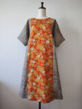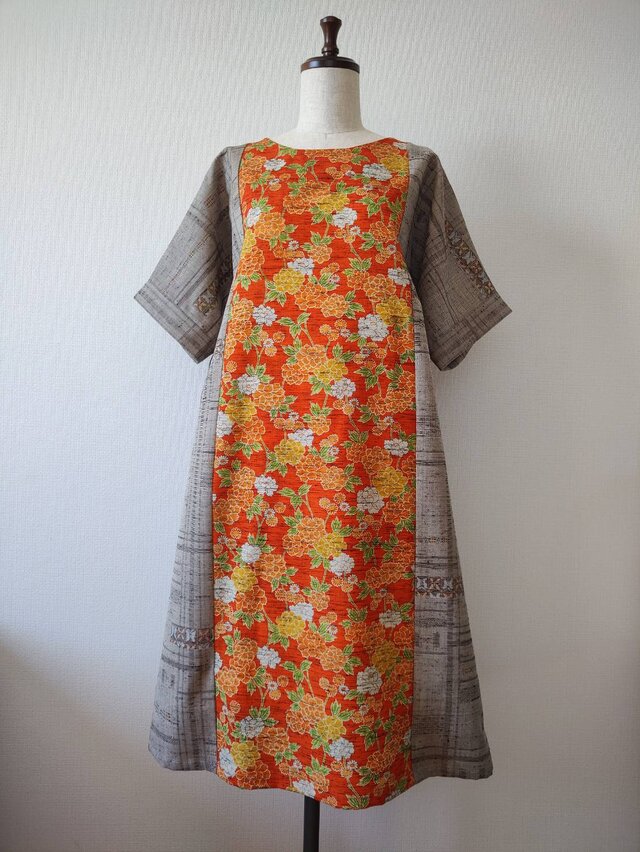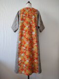 総柄の花模様と蝶々の飛び柄の二着の着物、なんとなく色味が似ていたので一着のワンピースにしてみました。