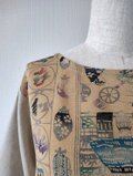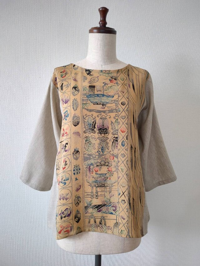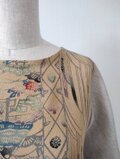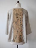 どこか芹沢銈介の染色を思わせるような型染めの着物と生成り色の服地とを組み合わせたトップスとなります。