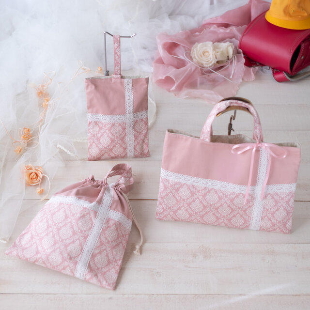 上品なダマスク柄の入園入学 基本の3点セット:くすみピンク |レッスンバッグ・上履き入れ・体操着袋のコピー