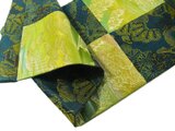 ■帯を繋いでリメイクいたしました。青っぽい部分はおよそ100年前の帯地を使用しています。玉虫色の帯地と交互につないでモダンな雰囲気に仕上げました。1と2枚目の画像はイメージ画像になり実物と若干柄の幅が違います。3枚目以降の画像を参考にしてください。