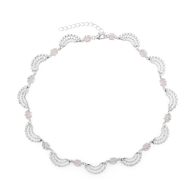 リズミカルに配置されたスカラップ状のラインが、レースのような軽やかさを生み出し、その合間に淡いピンクカラーの石がアクセントとして添えられています。