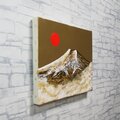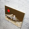 本作品の特筆すべきポイントは、画面全体に施された金色の表情です。光の当たり方によって変化するその輝きは、ただの背景にとどまらず、まるで富士山と赤い太陽の物語を語りかけてくるかのようです。特に印象的なのは、左上に昇る鮮やかな赤い太陽です。黄金色の富士山とそのコンビネーションは、商売繁盛や願望成就を象徴する「旭日黄金富士」の名に相応しい、美しい縁起の良いモチーフとなっています。