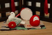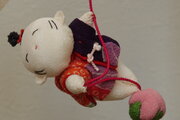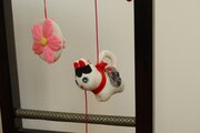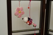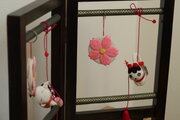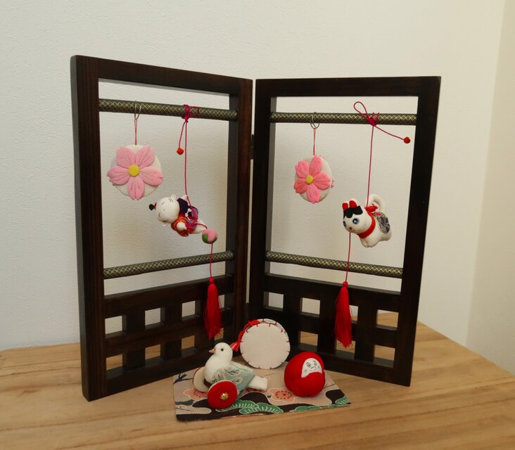 ちりめん細工と押絵の技法で作った7つの飾りで、衝立飾りに仕立てました。