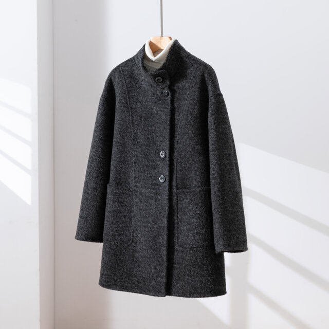 シンプルなニットドレスやパンツスーツの上に羽織るだけで、一気に品格と温もりをプラス。立襟が顔周りをすっきりと見せ、フォーマルな場面でもふさわしい存在感を発揮します。