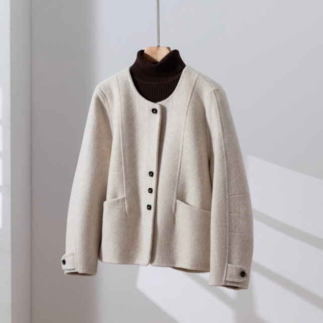 軽やかで温かなショートコート ウール混ダブルフェイスショートコート ベージュ 260107-1