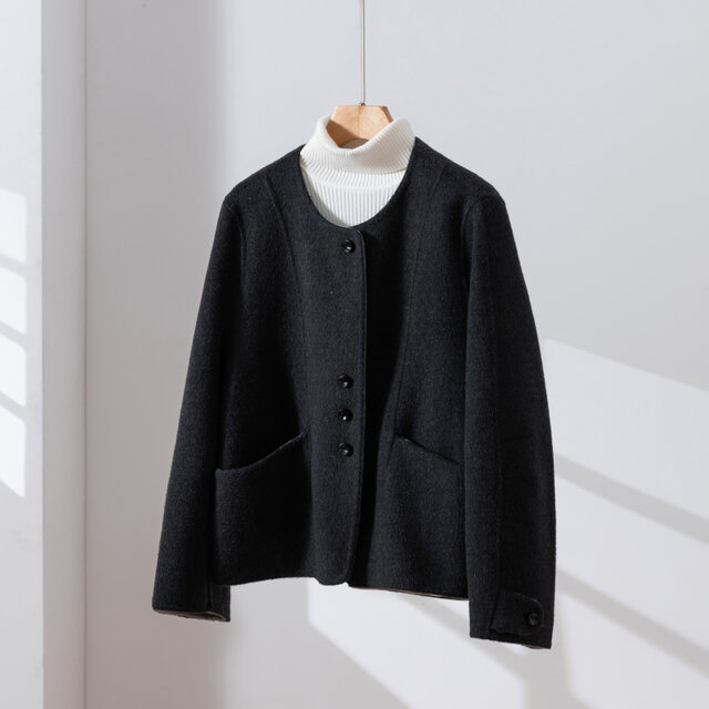 軽やかで温かなショートコート ウール混ダブルフェイスショートコート ダークグレー 260107-3