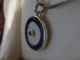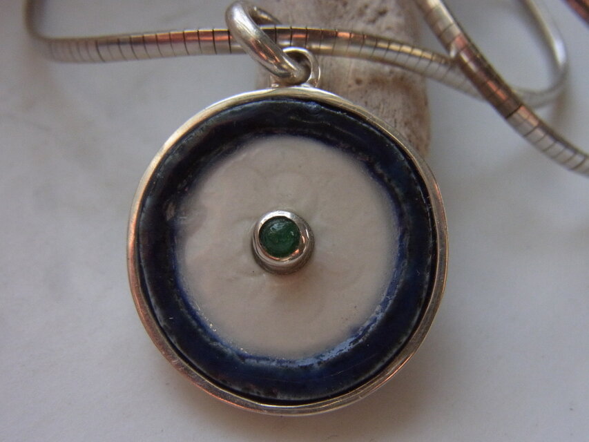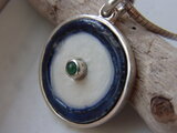 藍染陶器をシルバー枠で囲み、中央にエメラルドを入れました。