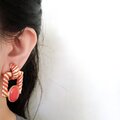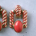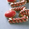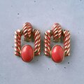 1946年からアメリカのHerbert & Pohs, Incから創業したコスチュームジュエリーブランドbergère(ベルジェール)のコーラルトーンのエナメルのストライプとオーバルカボションがあしらわれたスクエア型のドアノッカーデザインの大ぶりなヴィンテージイヤリングです。