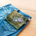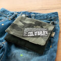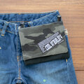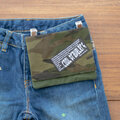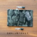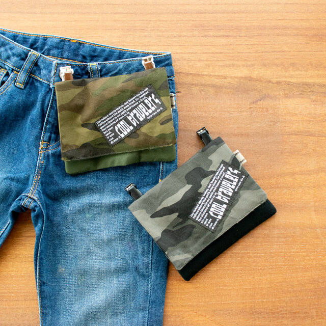迷彩柄(カモフラージュ柄)に、オリジナルの刺繍タグ。