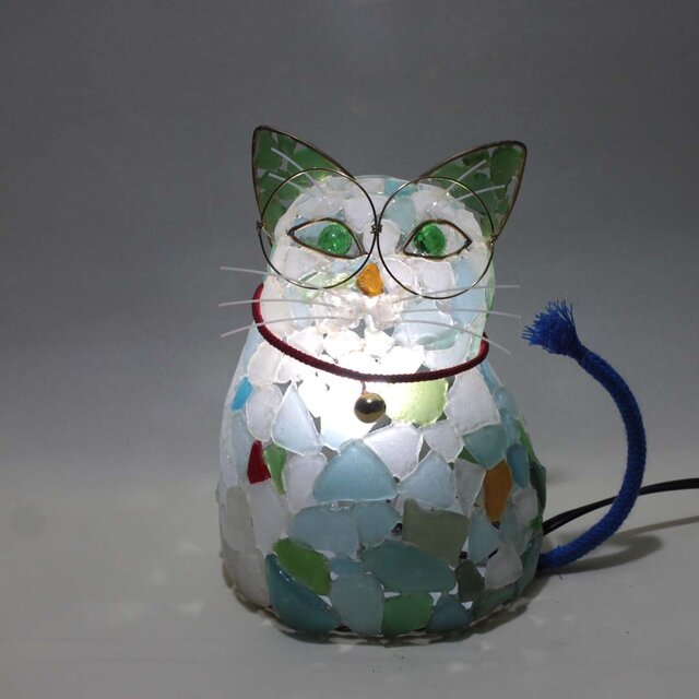 シーグラスランプ 猫らんぷ-19かわいく、品よく、白い棚に溶け込みました。 灯りの広がりがキレイです。 点灯していない時もシックです。