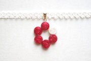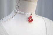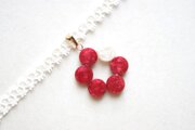 椿のような深紅のなか一色だけ違う差し色の白が清廉な印象のレジンを、サテンリボンにタティングレースで装飾を施したチョーカーに仕上げました。