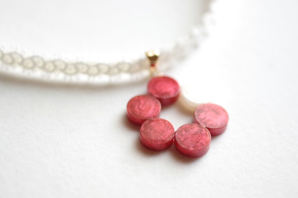 【受注製作】レジンアート ラウンドモチーフとタティングレースとサテンリボンのチョーカー〈丸を連ねて・椿2〉