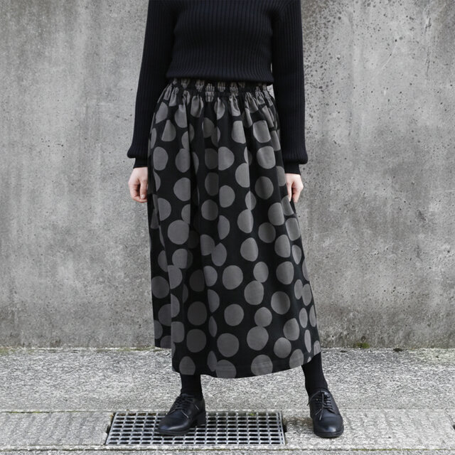シックな雰囲気で、合わせやすいランダムドットのスカートです。