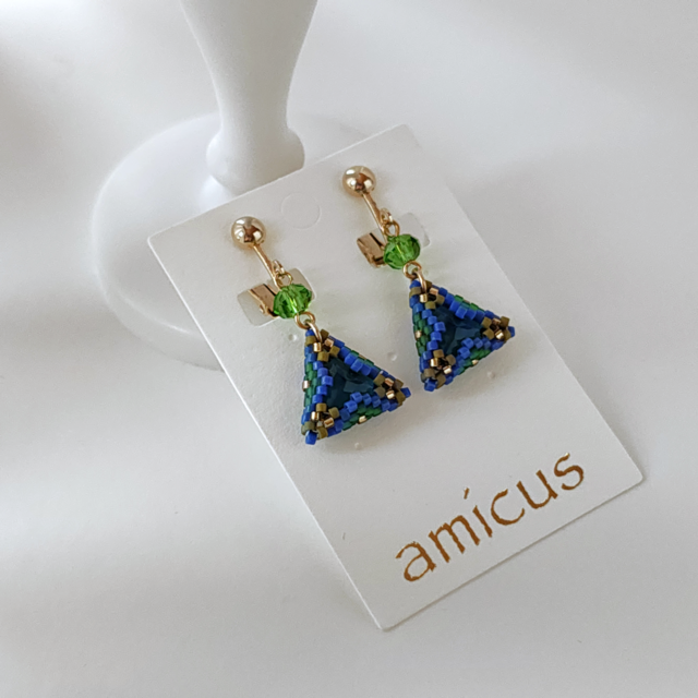 三角形のカボションをペヨーテステッチでくるんでいます(Beaded bezel)。