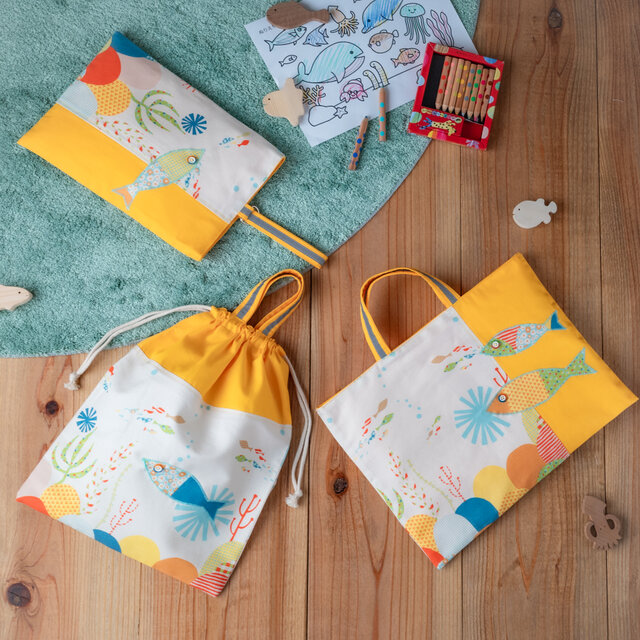 【2026年度新作】海のパッチワーク柄(サニーイエロー)入園入学 基本の3点セット|レッスンバッグ・上履き入れ・体操着袋