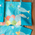 ・大きな生地を裁断し、柄に合わせて、ひとつひとつ物語をつくるように、魚の向き・配置・目のボタンの色を選んで仕上げています。