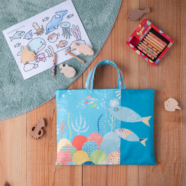 *魚のパッチワーク部分は布同士を重ねて縫う構造のため、引っかかりや摩擦が強いと端がほつれる場合があります。お取り扱いにはご注意ください。