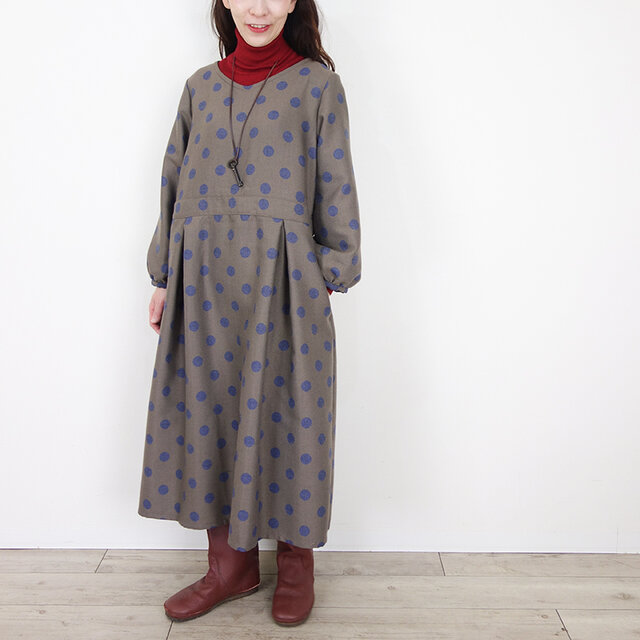 落ち着いたブラウンとネイビーが重なり合うドット柄は、