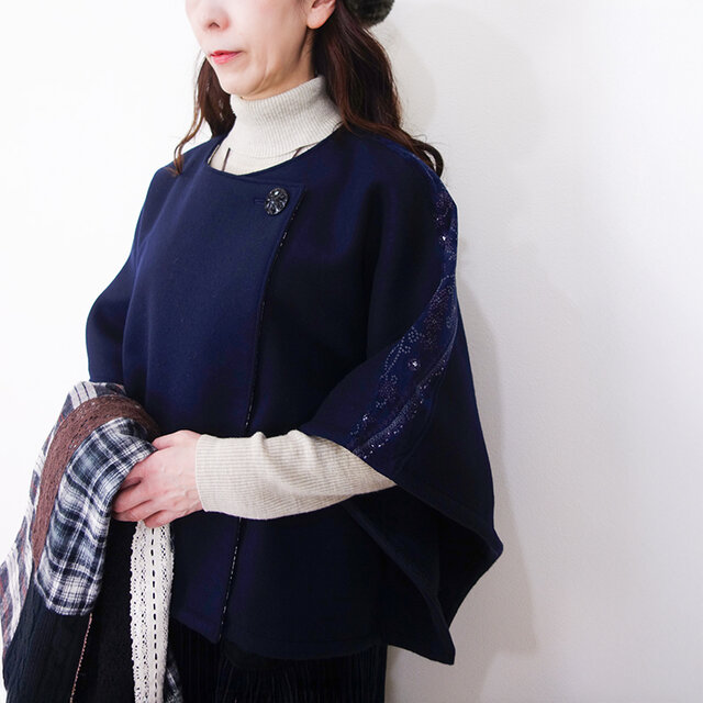 あたたかなネイビーウールに、美しいネイビートーションレースを贅沢にあしらった羽織りケープです。