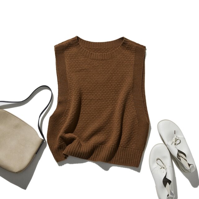 軽やかで上品なこのベストは、シンプルな装いにも立体感と温もりを添えます。季節を超えて愛用できる、クローゼットの頼れる一枚です。