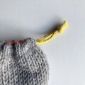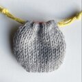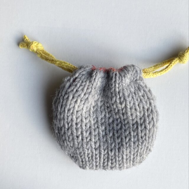 巾着の紐は異なる黄色のソックヤーンを二本使用して棒針編みで編んで作りました。
