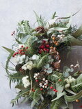 海からの潮風に葉を揺らすユーカリやヤマシダと、可愛らしい木の実が織りなす、生命力あふれる冬の風景をリースに仕立てました。
