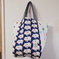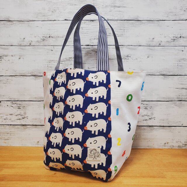 ブタさん柄×カラフル数学柄で4枚はぎのころっとした大きめバッグを作りました。