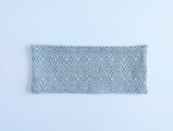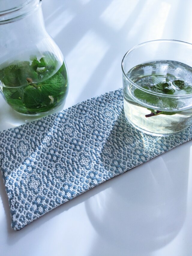 経糸に白い綿糸、緯糸にくすんだ水色の麻糸を用い、オーバーショット織りでミニマットに仕立てました。
