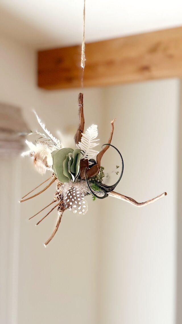 流木と自然素材を組み合わせた、フライングオーナメントです。