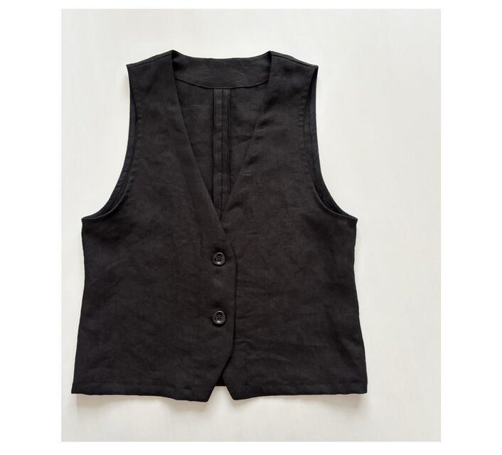 適度な厚みとしなやかさのあるベルギーリネンのキャンバス地を使用したシンプルなベスト。光沢感があるので上品な印象でシーズンレスでご着用いただけます。