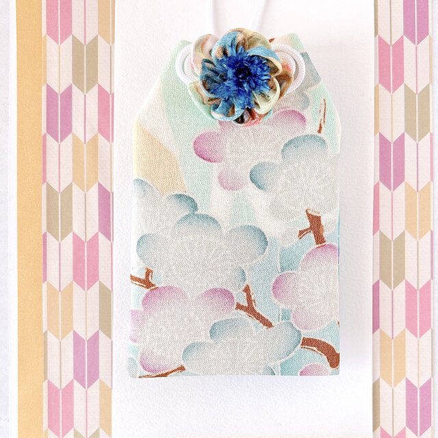 青と赤紫の梅が枝に咲き匂う雅趣ゆたかな着物生地を使用し、青梅のつまみ細工を添えました