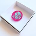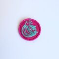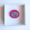 サーモンピンクの地に黒い花の刺繍、ありそうでなかったこの色のとりあわせ、すてきなブローチでした。