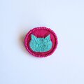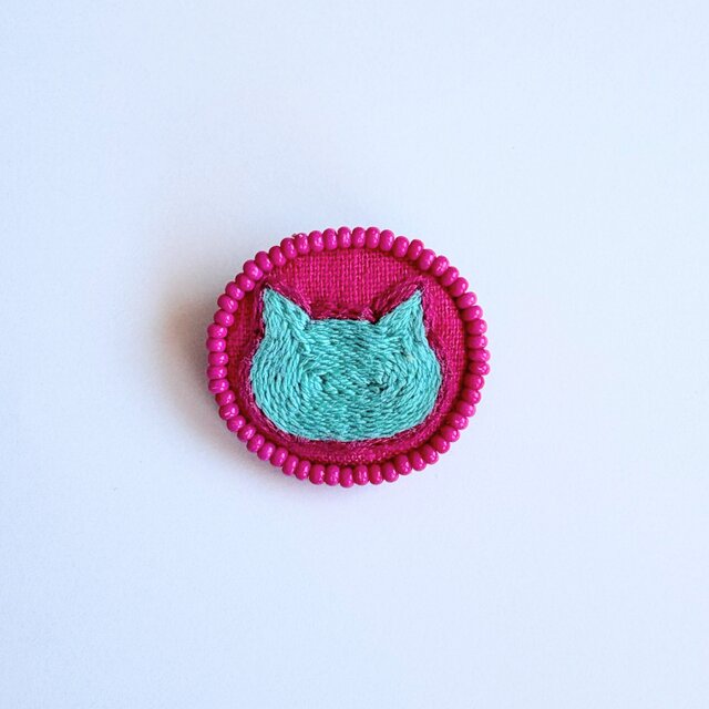 フューシャピンクのリネンに北欧風の素朴なデザインでこねこを丁寧に手刺繍しました。
