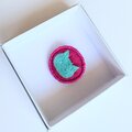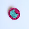 サーモンピンクの地に黒い花の刺繍、ありそうでなかったこの色のとりあわせ、すてきなブローチでした。