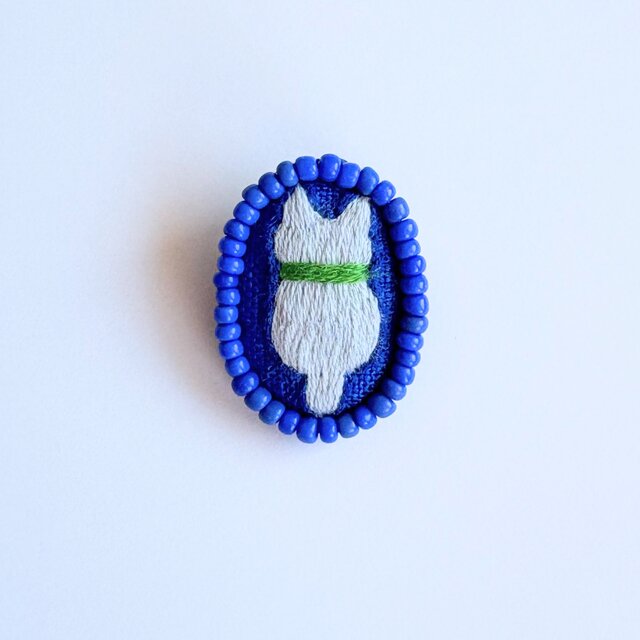 サファイアブルーのリネンにこねこを丁寧に手刺繍しました。