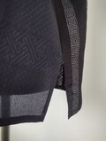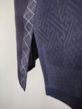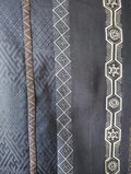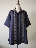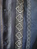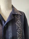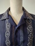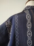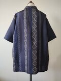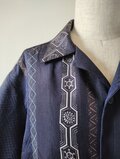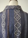 縦縞の幾何学模様の帯だった生地と地模様のある紺色の無地の着物を組み合わせたメンズサイズのアロハシャツとなります。