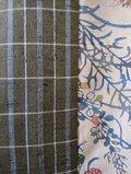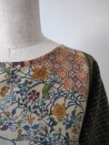 草木染めのような落ち着いた色使いは服地にはない魅力的な日本っぽさがあり、抹茶色の紬織の格子柄とも色がよく合って一着の服として違和感なく溶け込んでいます。七分袖ですのでインナーを組み合わせて袖口から出していただければ様々な色との組み合わせもお楽しみいただけます。パンツを合わせてチュニックとしてお作りしましたが小柄な方でしたらワンピースでも可能です。
